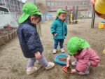 2歳児は、手で混ぜながら絵の具遊びを楽しみました。ヌルヌルとした感触や色が混ざっていく面白さを感じていたようです!また、園外散歩で見つけた木の実を集めてケーキ作り🎂どれもこだわりの逸品です‼