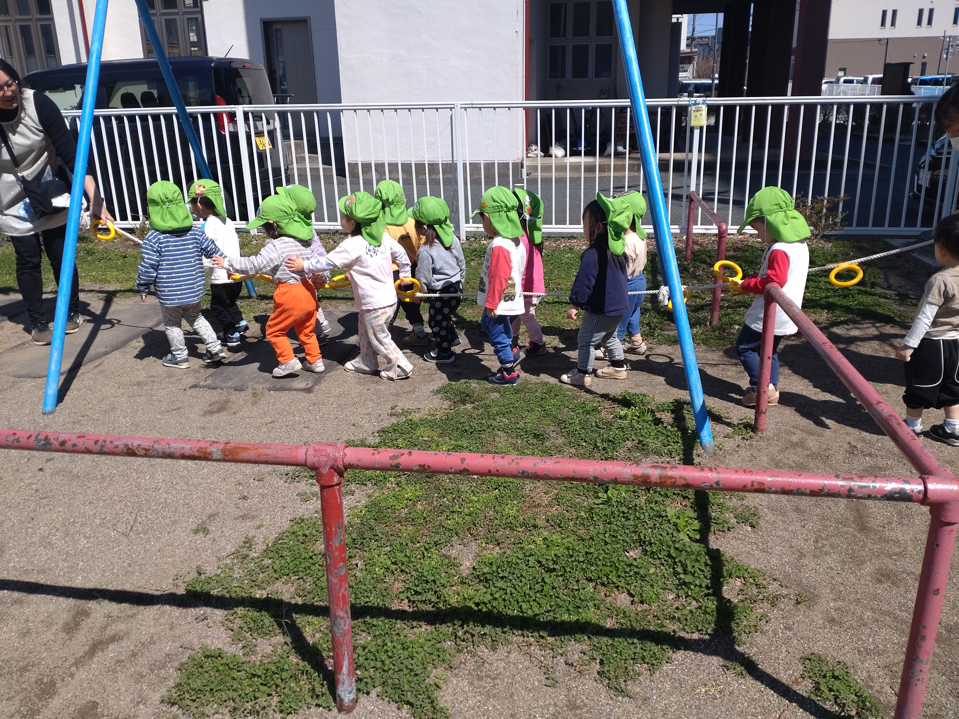 立っているだけでもカワイイ保育部の子ども達は、先生の「おいで~」の声にかけ出す子もいれば、フリーズする子も…😅大きい子たちの練習風景を見ながら、運動会のにぎわいを感じているようでした!