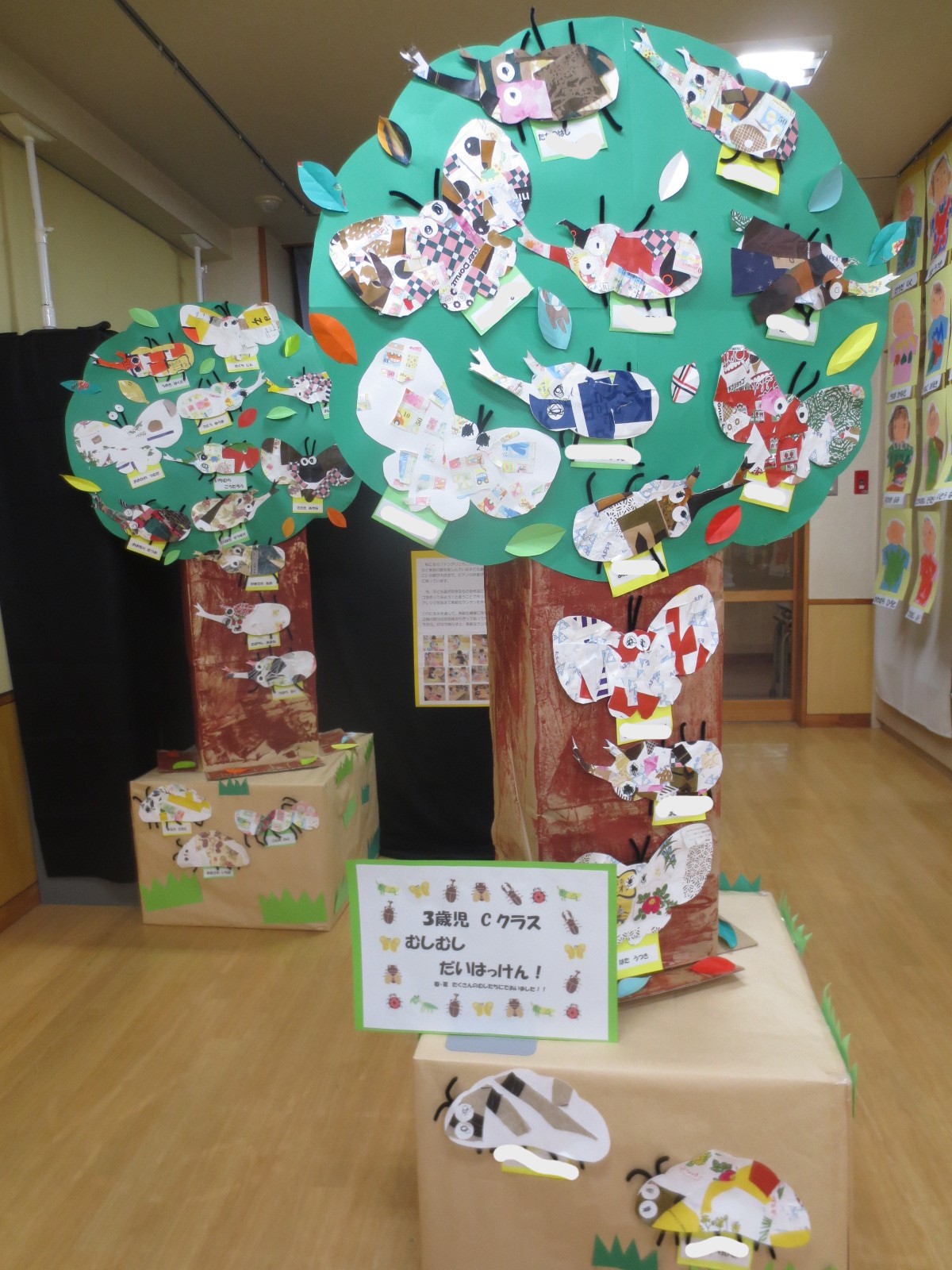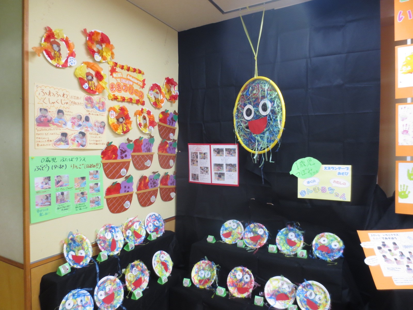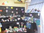 今年は、様々な素材にふれて感触を楽しんだり、自分なりのイメージを表現したりする中で、できた作品を大切に取り組んできました。個性がキラリと光るその子らしい作品が並んでいます。取り組んでいる子ども達の写真を見ながら、保護者の方も目を細めながら観覧してくださいました!