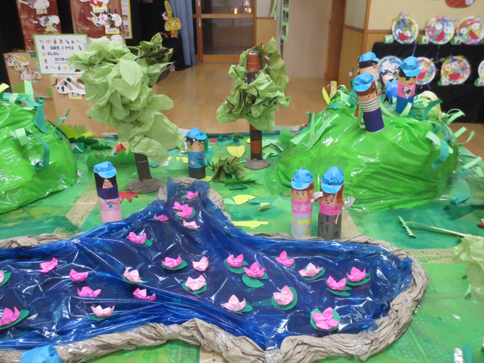 3歳児は親子で”カエル🐸の制作”をしました!出来あがったカエル🐸を持ってホールへ移動・・。たくさんの池に上手に⁉カエルを飛ばしていましたよ~😃