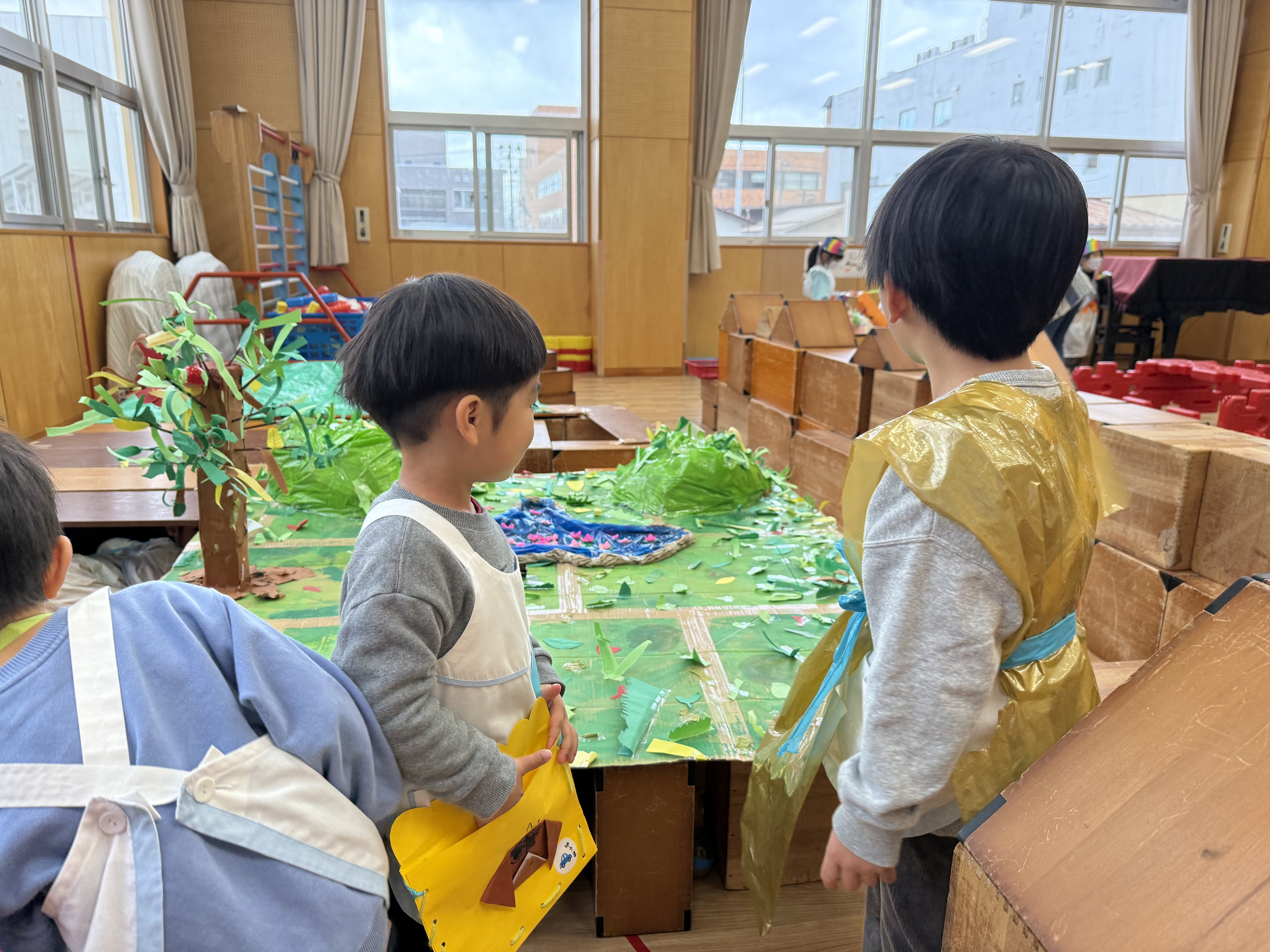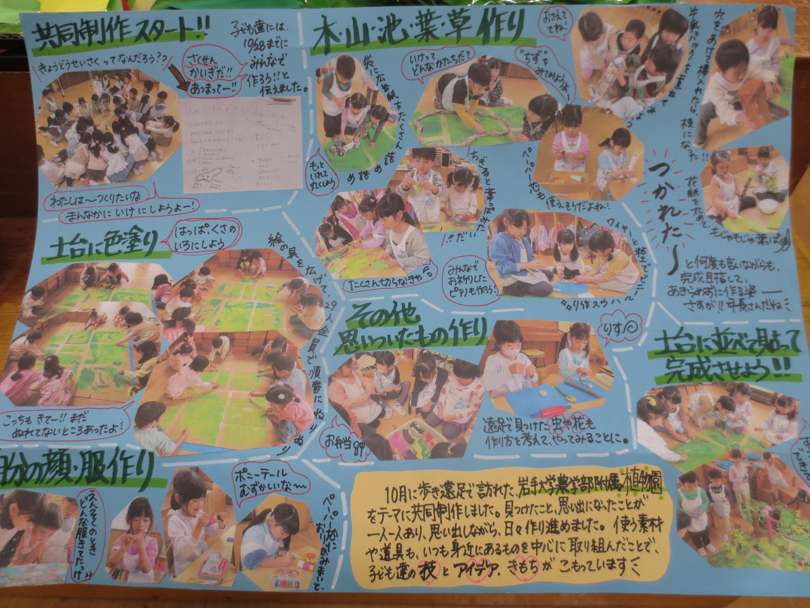 5歳児は、大活躍した運動会の思い出画を色鉛筆などを使って丁寧に描きました。バルーンやマット取り、最後はキラキラの金メダルをもらったね🥇夏にみんなで見たプラネタリウムをきっかけに宇宙に関心を持ち、廃材を活かして宇宙の乗り物制作に挑戦☆彡少し難しいことにも集中して取り組んでいました!今年の共同制作は、遠足ででかけた岩大の植物園を再現。みんなで思い出しながら担当を分けて制作しました🌲偶然出会ったリスも🐿隠れています😊「なにで作ろうか…?」友達と相談しながら力を合わせて完成した大作‼