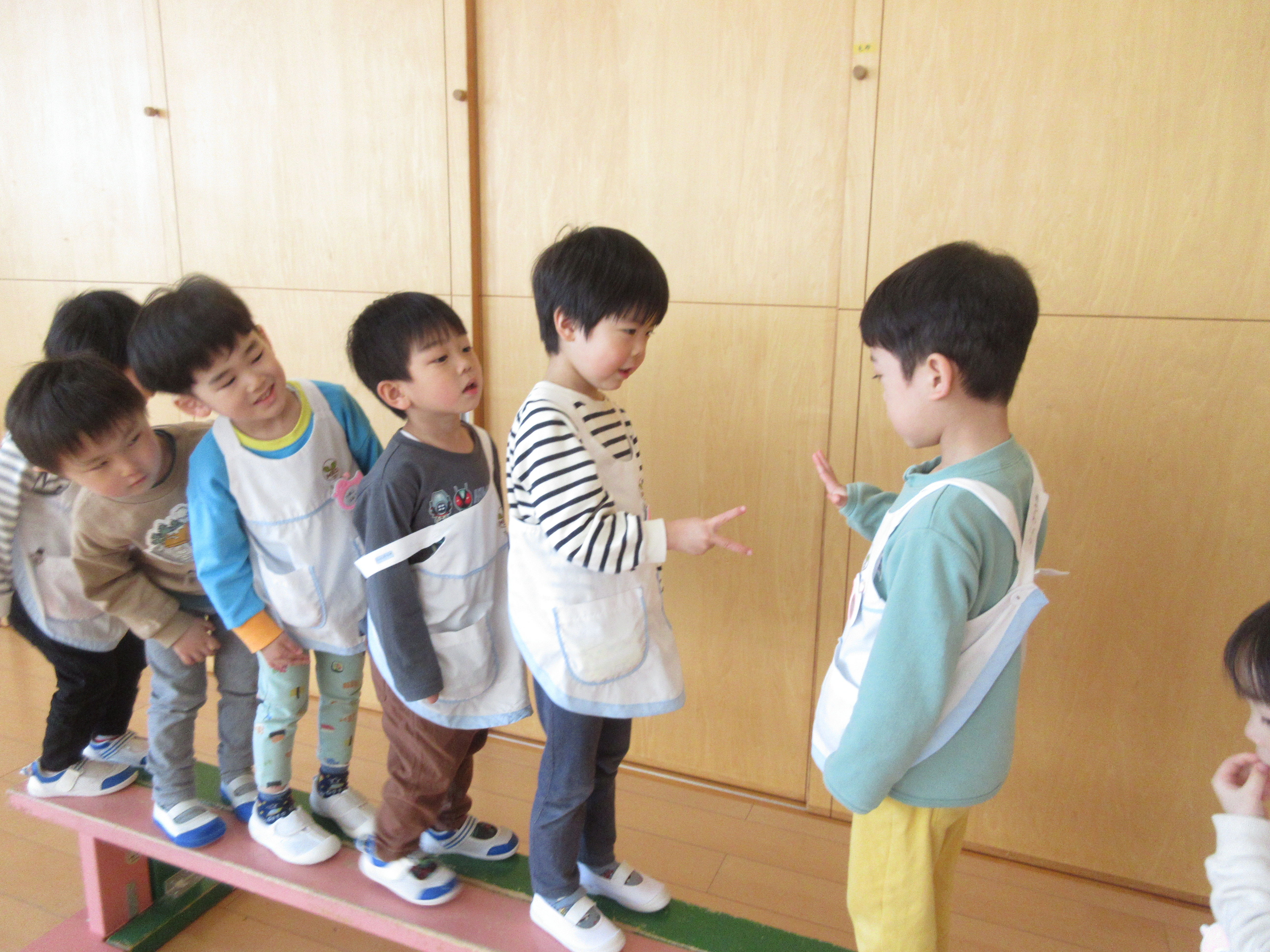 友だちへの親しみが増し、一緒に同じことをする喜び、なりきって遊んだりしている普段の様子の延長として参観日で「劇ごっこ」「劇あそび」としてお見せしているものです‼年少児は保育室で、そして年中児はホールのステージで披露しています❣